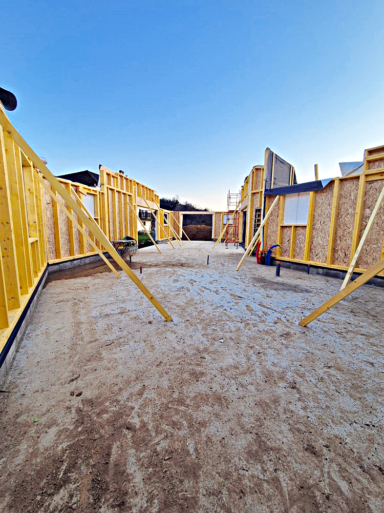 la livraison au stade « hors d’eau hors d’air isolé » : OIKOS effectue le levage des murs et réalise l’isolation et l’étanchéité à l’air. La charpente et couverture sont posées avec le concours d’un charpentier local et les menuiseries extérieures avec le concours d’un menuisier local